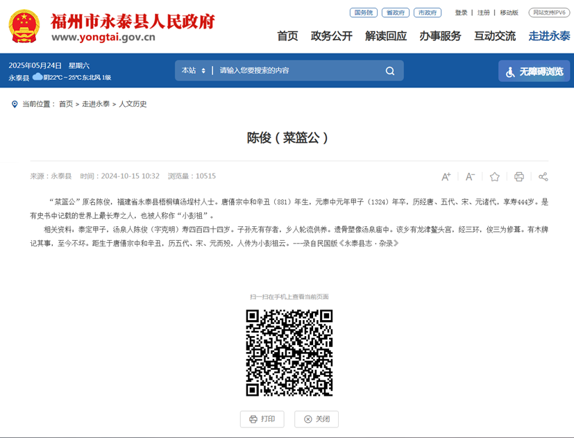 相关资料:泰定甲子,汤泉人陈俊(字克明)寿四百四十四岁。子孙无有存者,乡人轮流供养。遗骨塑像汤泉庙中。该乡有龙津鳌头宫,经三环,俊三为修葺。有木牌记其事,至今不坏。距生于唐僖宗中和辛丑,历五代、宋、元而殁,人传为小彭祖云。---录自民国版《永泰县志·杂录》
